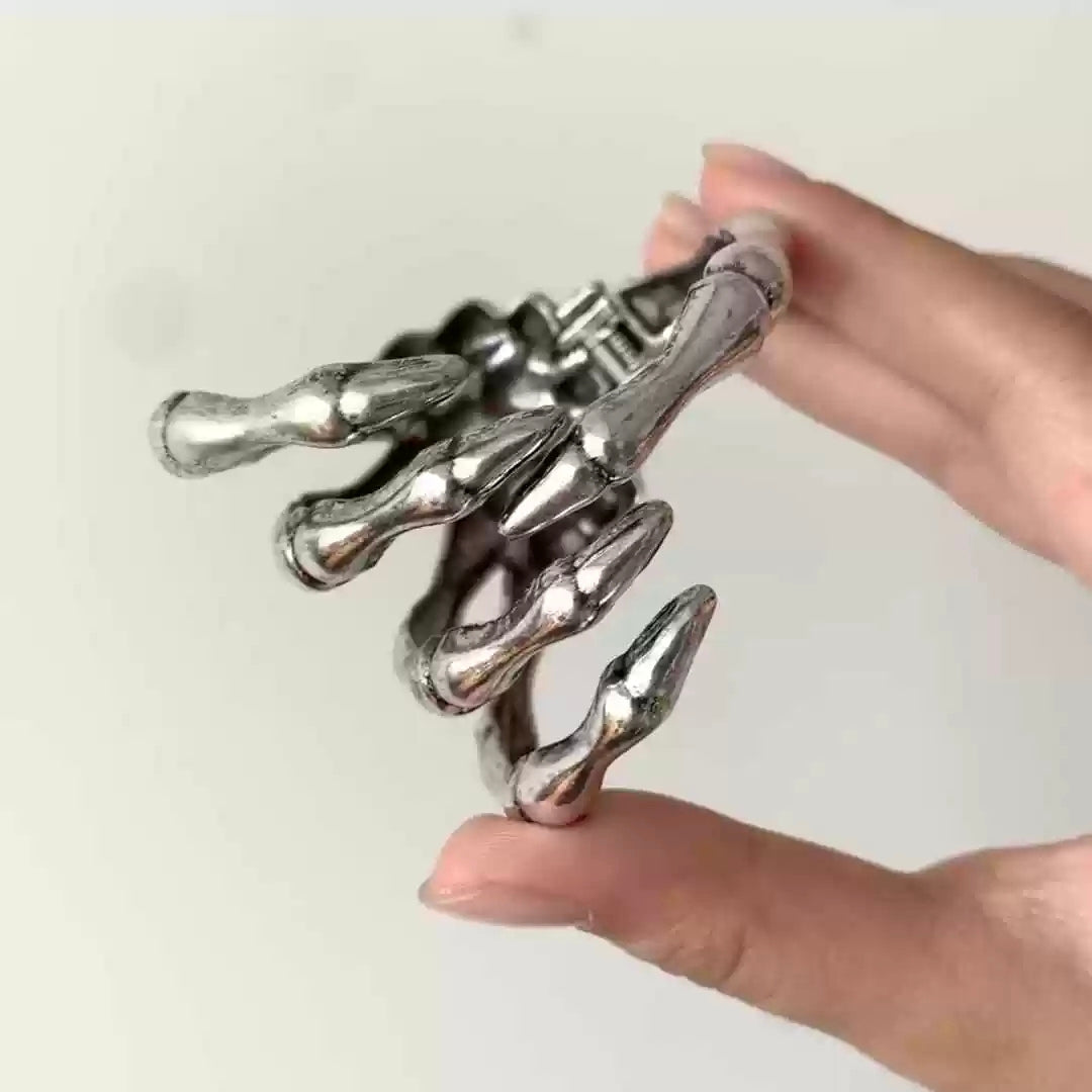 A bold statement piece designed to wrap your wrist in dramatic, gothic style. This unique cuff features a striking skeleton hand or claw design, with articulated sections that flex and conform to your arm for a comfortable and secure fit. It's the perfect accessory to add a rebellious edge to any outfit.