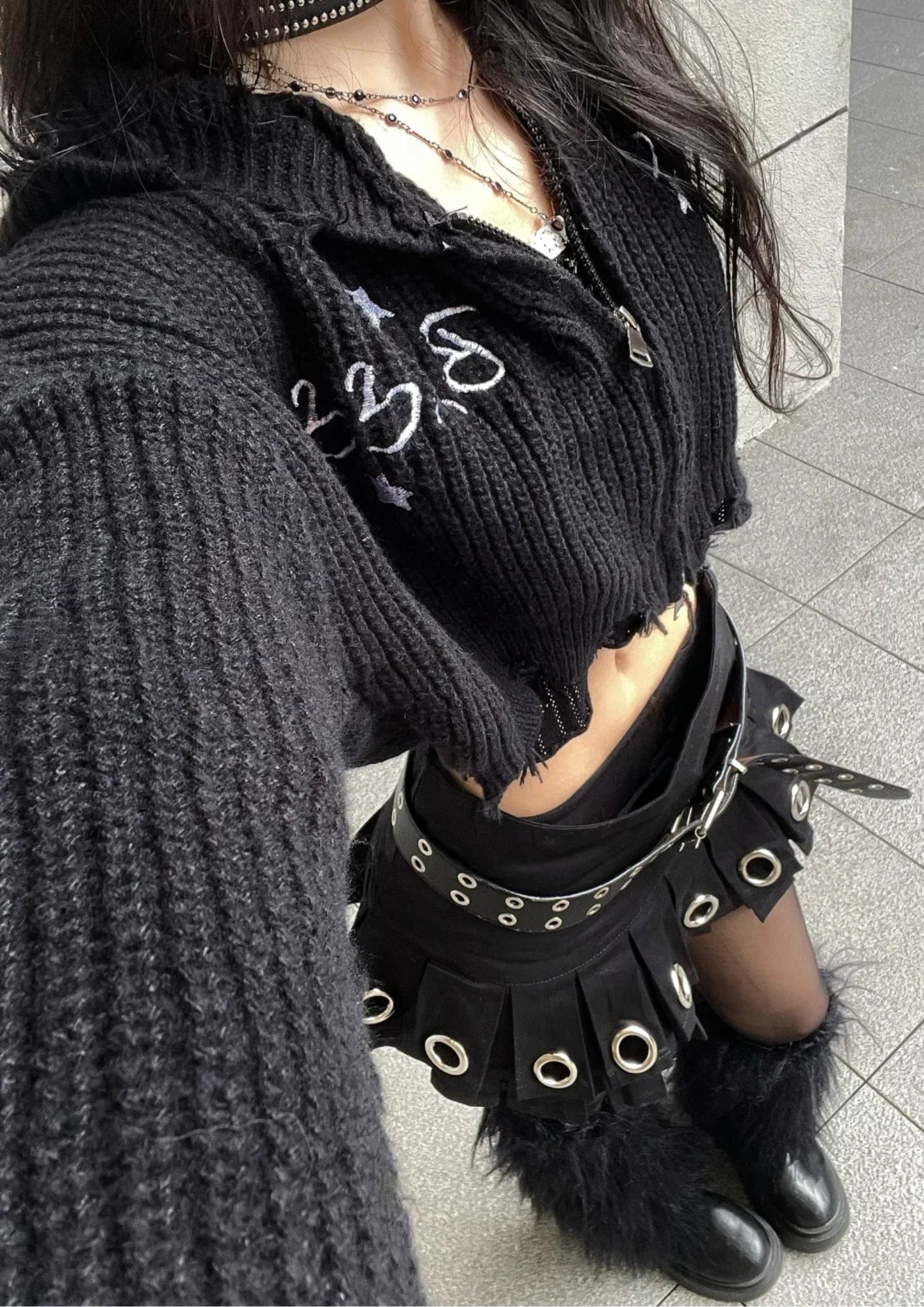 Unleash your inner punk with this hard-hitting pleated mini skirt. The aggressive grommet detailing and defiant low-rise cut create a powerful silhouette that's ready for the mosh pit or the city streets.