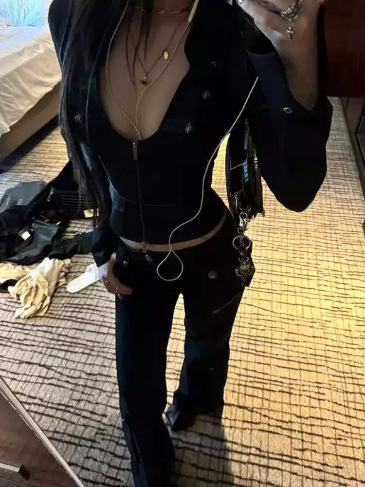 This retro-inspired black top is designed with a slim fit silhouette and structured details that highlight the waistline. Featuring long sleeves and a cropped cut, it adds a bold and sophisticated edge to modern streetwear and night-out outfits.