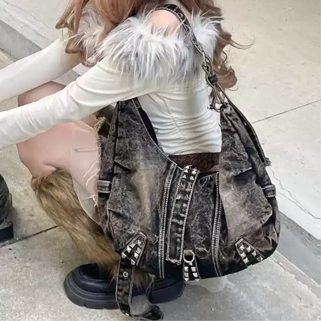 This shoulder bag combines casual denim style with edgy stud detailing for a bold finish. Designed with a spacious slouchy body and a wide adjustable strap, it balances function with statement design. Perfect for daily wear, festivals, or street-style outfits, it offers enough room for all your essentials while standing out with its unique detailing.